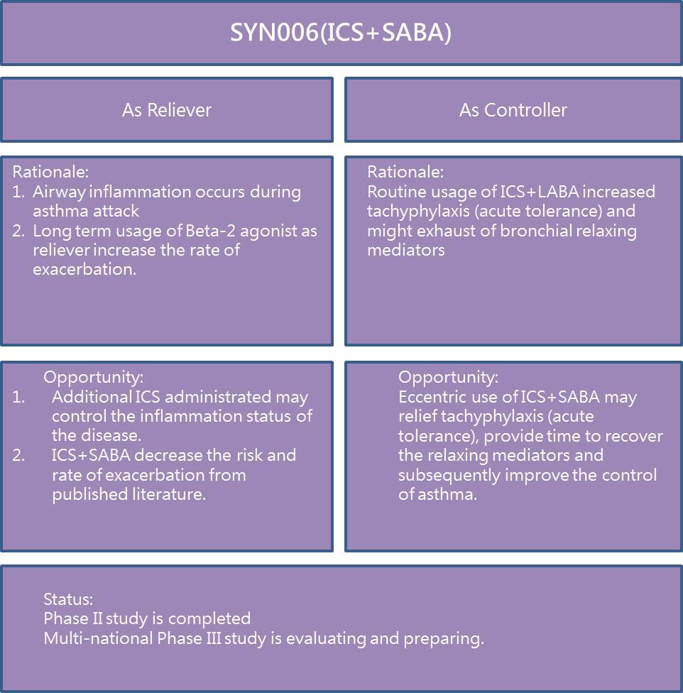 SYN006 HFA MDI is a unique combinational product with inhaled corticosteroid and short acting beta-2 agonist (ICS+SABA). A Phase II dose response study is completed in 2014 and multi-national Phase III studies are preparing for submission. The product is primarily used against emergency treatment (reliever) to relief the bronchoconstriction symptoms when asthma attacks. In addition, it can also be used as maintenance therapy which might improve the drug resistance issues of existing drugs for asthmatic patients. Patent of pharmaceutical combination has been granted from US, China, Canada, Australia, New Zealand, South Korea and Hong Kong. Applications for other countries and regions are also under reviewing.